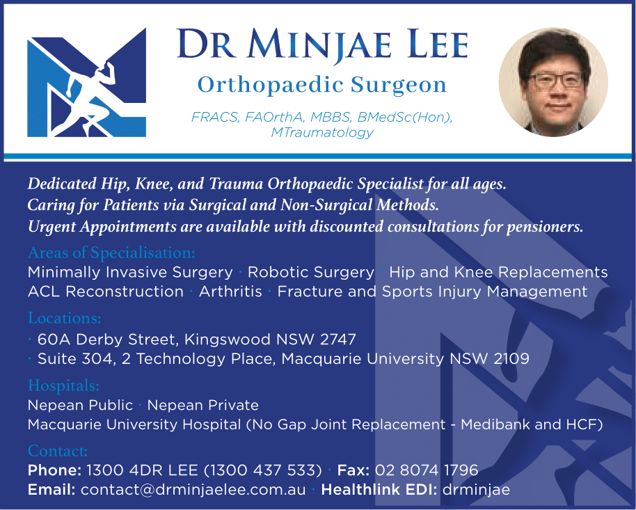 Dr Lee's areas of Specialisation include: Arthroscopic Surgery, Joint Replacement, Hip & Knee Surgery, Fracture, Trauma and Sports Injuries