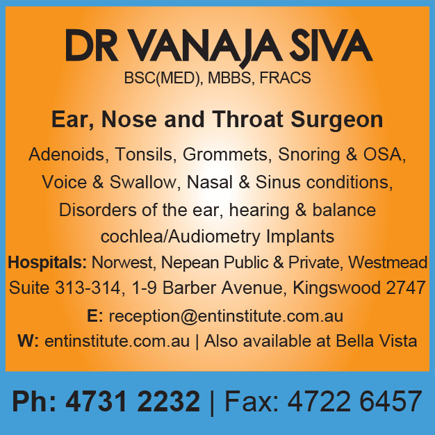 Add Listing Dr Vanaja Siva Dr Vanaja Siva Home » Specialist » Dr Vanaja Siva Contact Information Address: 313-314/1-9 Barber Ave, Kingswood 2747 Phone: 4731 2232 Fax: 4722 6457 Email: reception@entinstitute.com.au Category: Otolaryngology / ENT Map